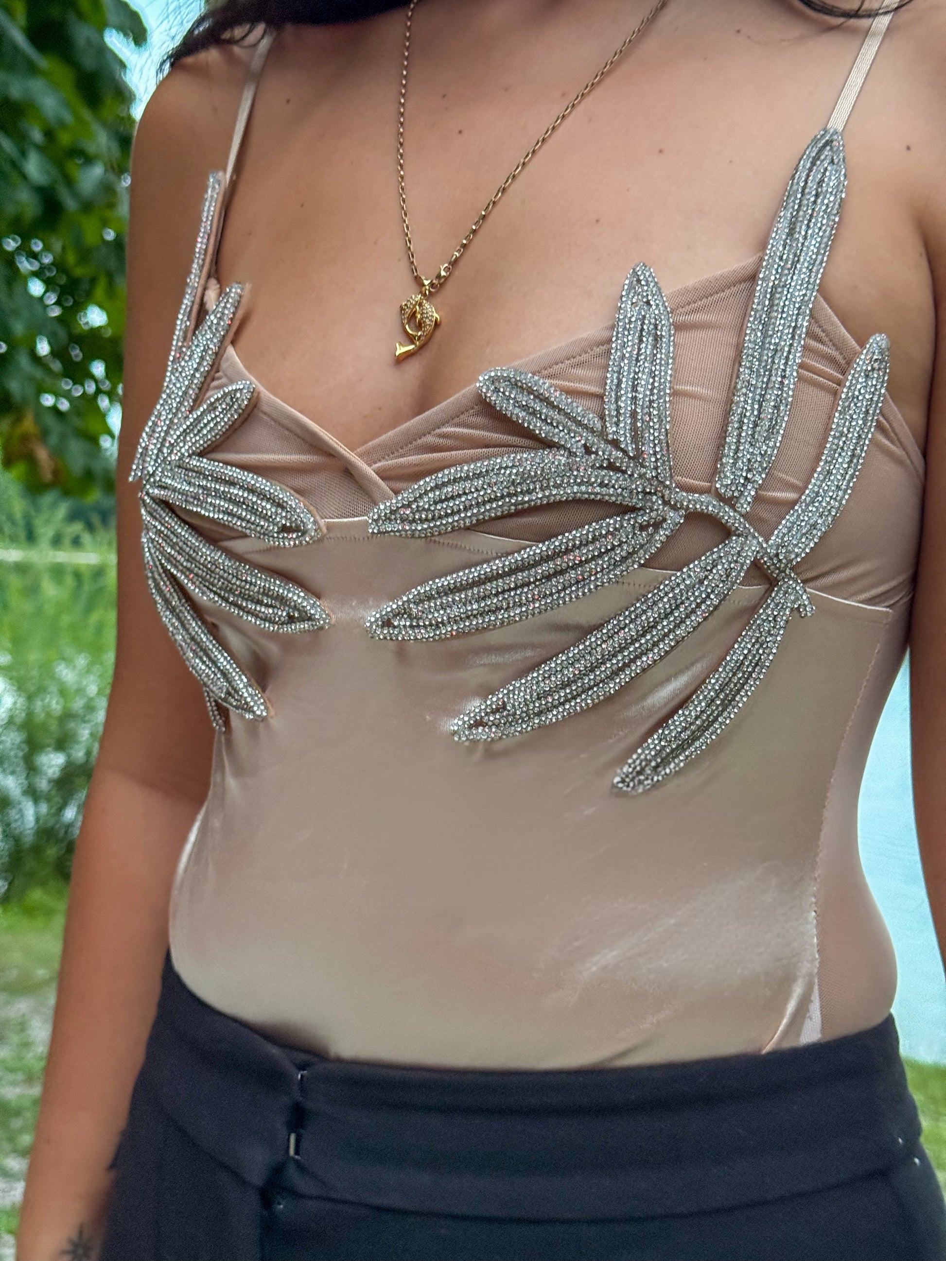 Ein glamouröser Hingucker mit aufwendiger Strass-Stickerei – perfekt für laue Nächte, Aperitivo-Momente und elegante Sommerabende.