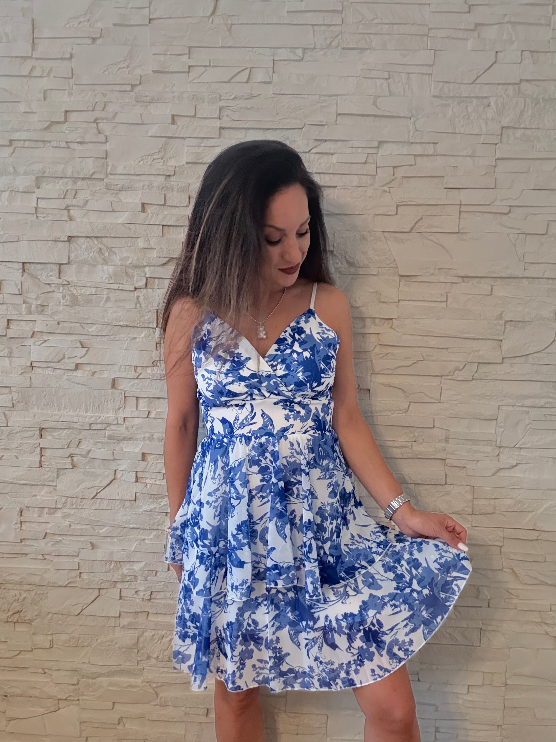 Urlaubsflair pur: Dieses fließende Sommerkleid mit mediterranem Blumenprint in Blau-Weiß bringt das Gefühl von Capri direkt in deinen Kleiderschrank. Leicht, verspielt und feminin – perfekt für heiße Tage und elegante Sommermomente.