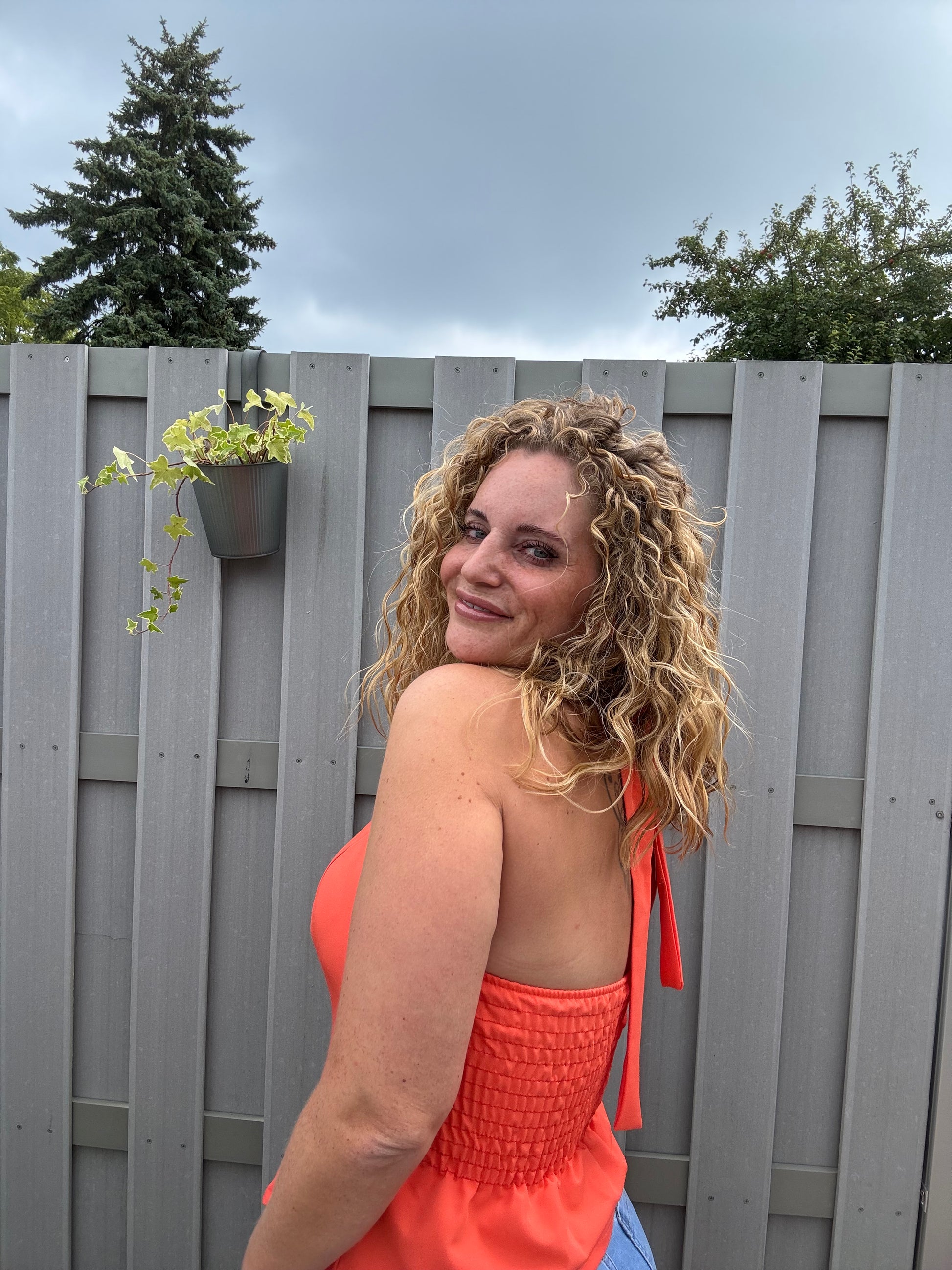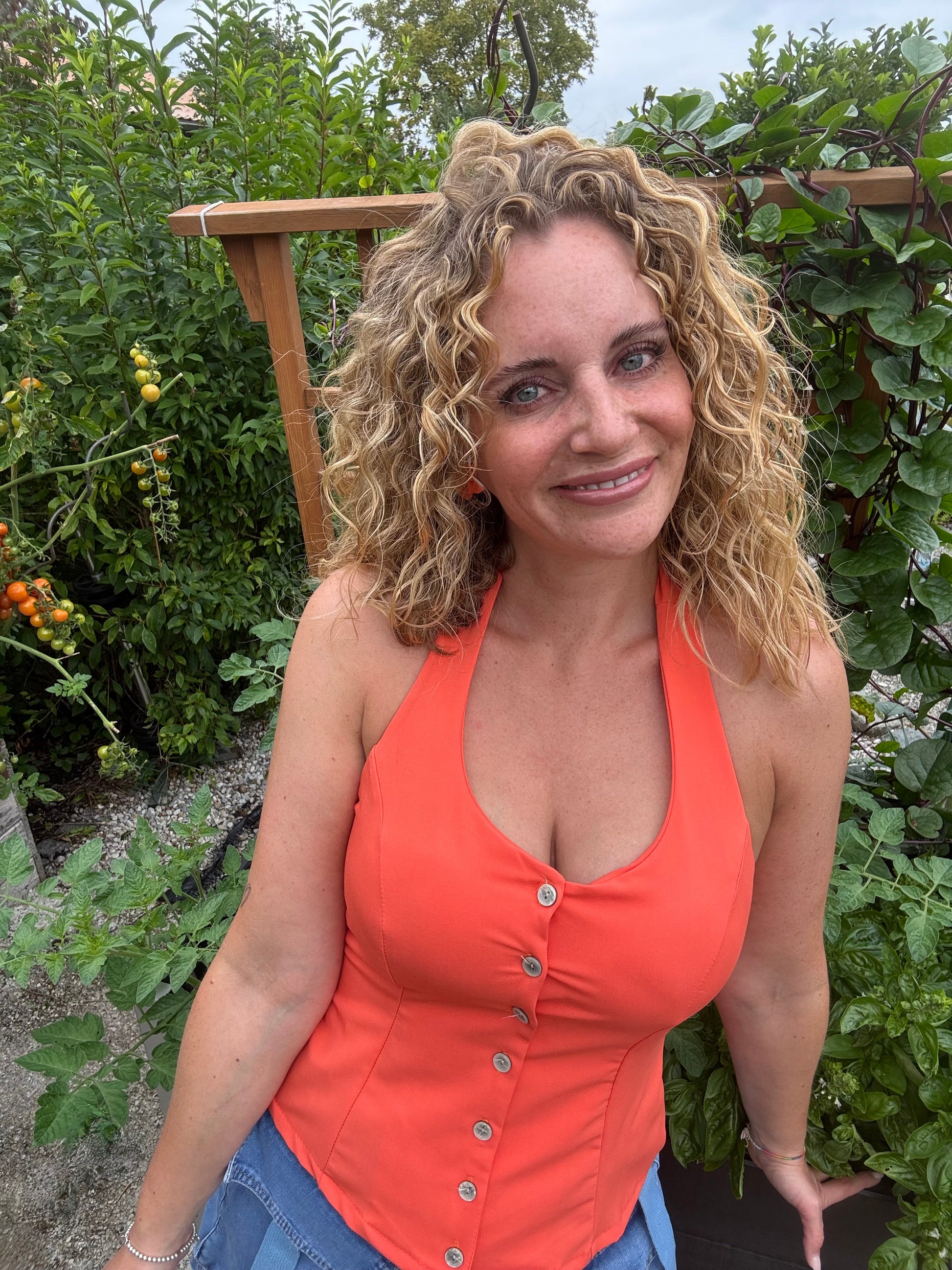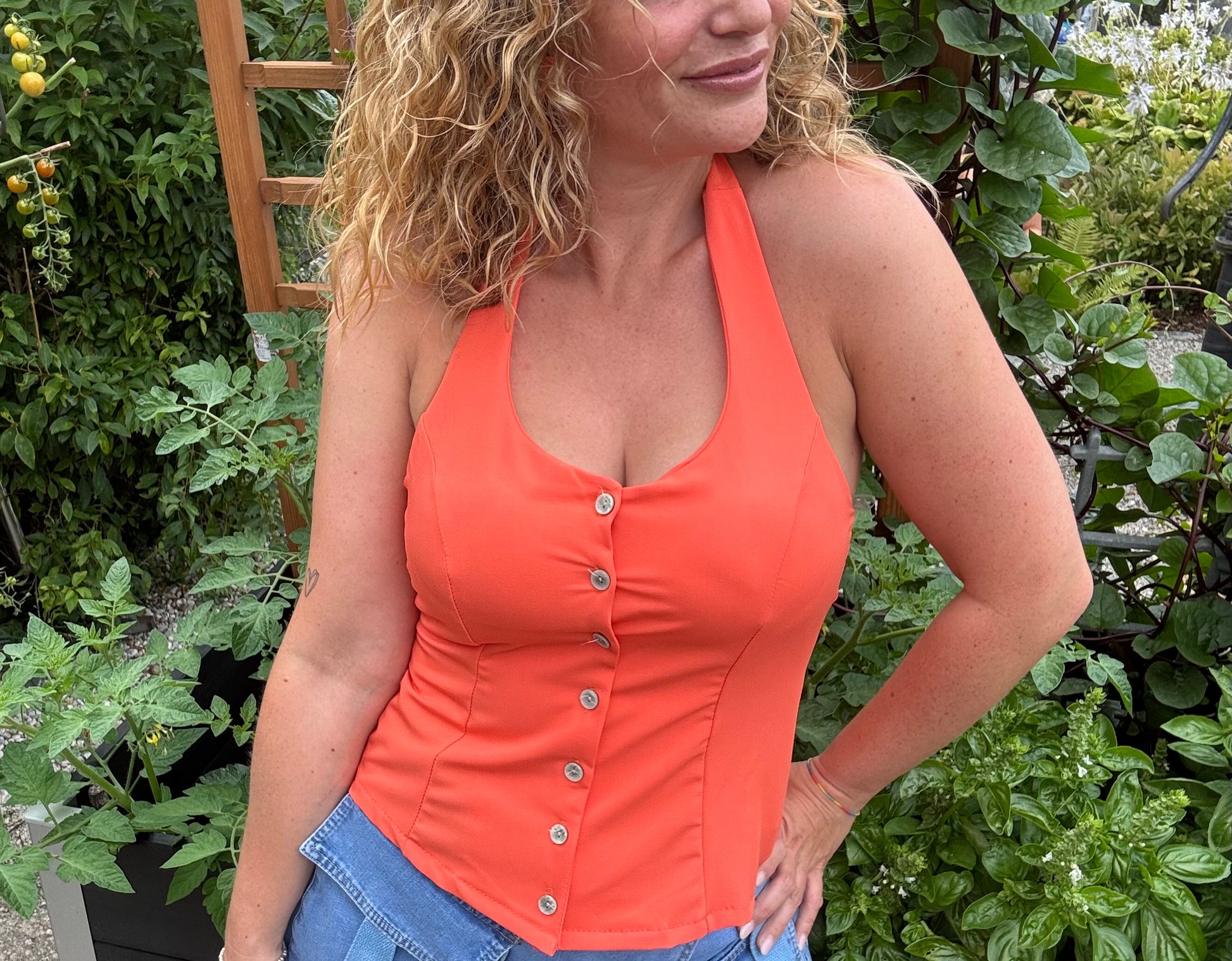Feminin, frisch und sommertauglich – dieses figurbetonte Halterneck-Top in leuchtendem Korallton ist ein echtes Highlight für warme Tage.