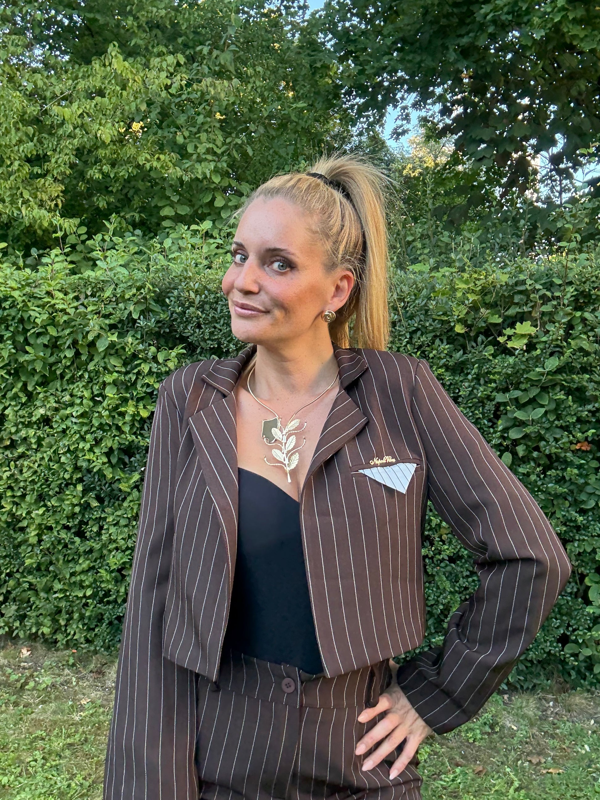 Die Cropped-Jacke mit Reverskragen und leicht verkürzter Länge harmoniert perfekt mit der High-Waist-Hose, die durch ihren weiten Fall besonders bequem ist. Zusammen ergibt sich ein Look, der sowohl im Alltag als auch für besondere Anlässe getragen werden kann – stylisch, modern und mit dem gewissen NapoliVibes-Charme.