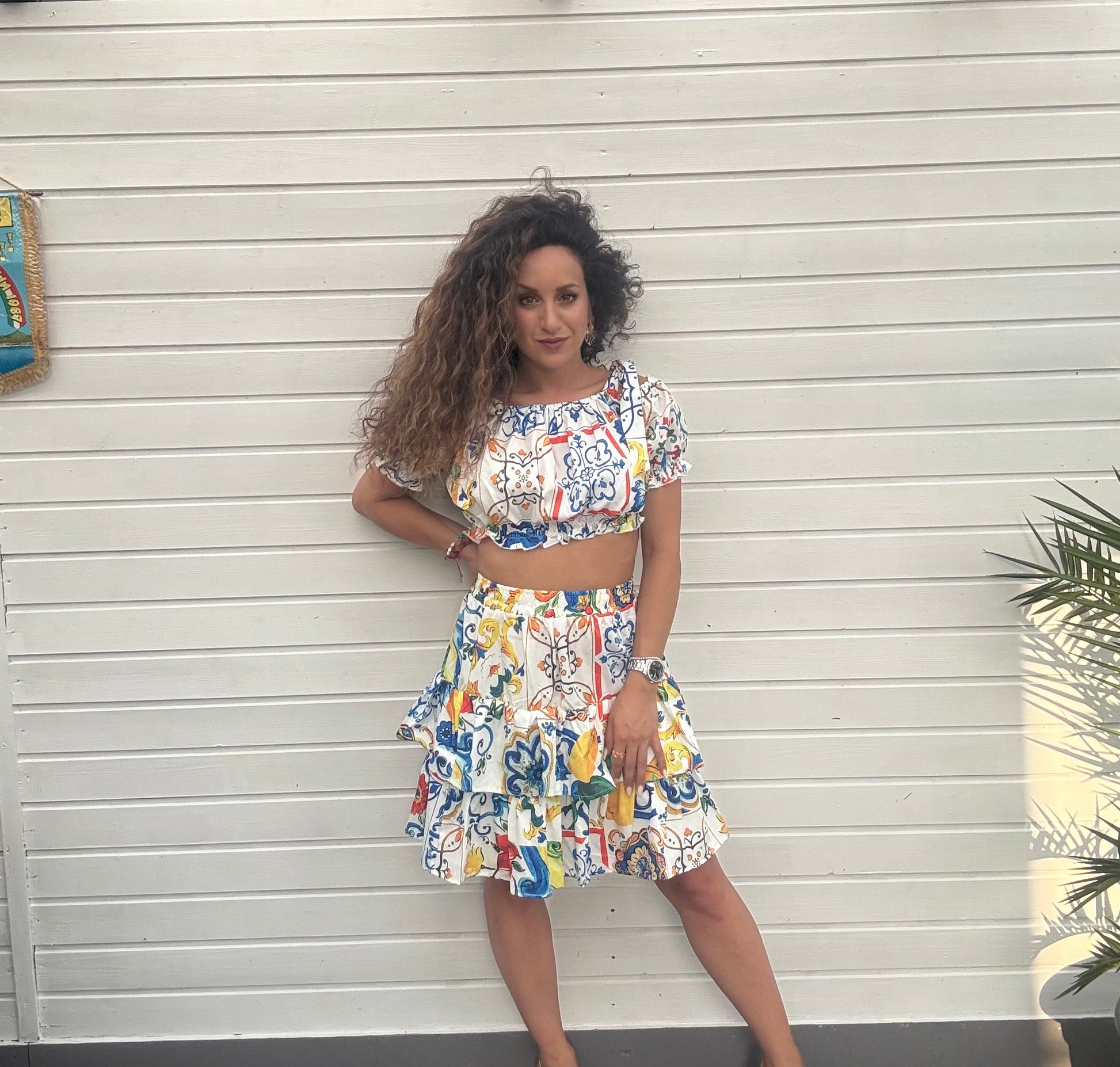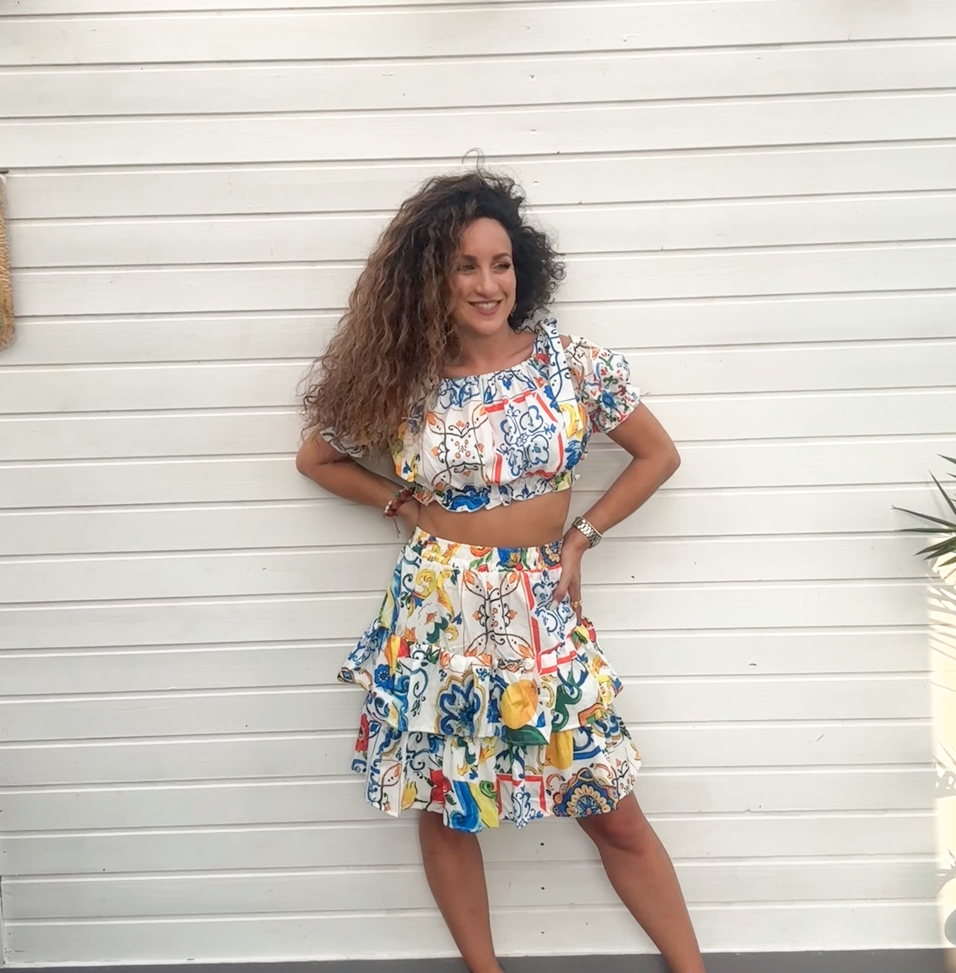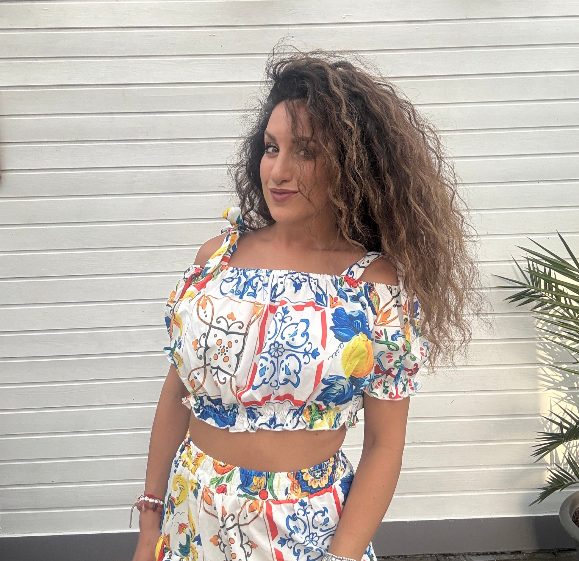 Ein Sommer-Set, das pure Italian Vibes versprüht: Der farbenfrohe Zweiteiler mit mediterranem Fliesenprint und Zitronen-Motiven bringt das Gefühl von Sonne und Amalfi direkt in deinen Kleiderschrank. Mit schulterfreiem Cropped Top und schwingendem Stufenrock zaubert er einen frischen, verspielten Look – ideal für Urlaubstage, Feste oder einfach, um den Sommer zu genießen.