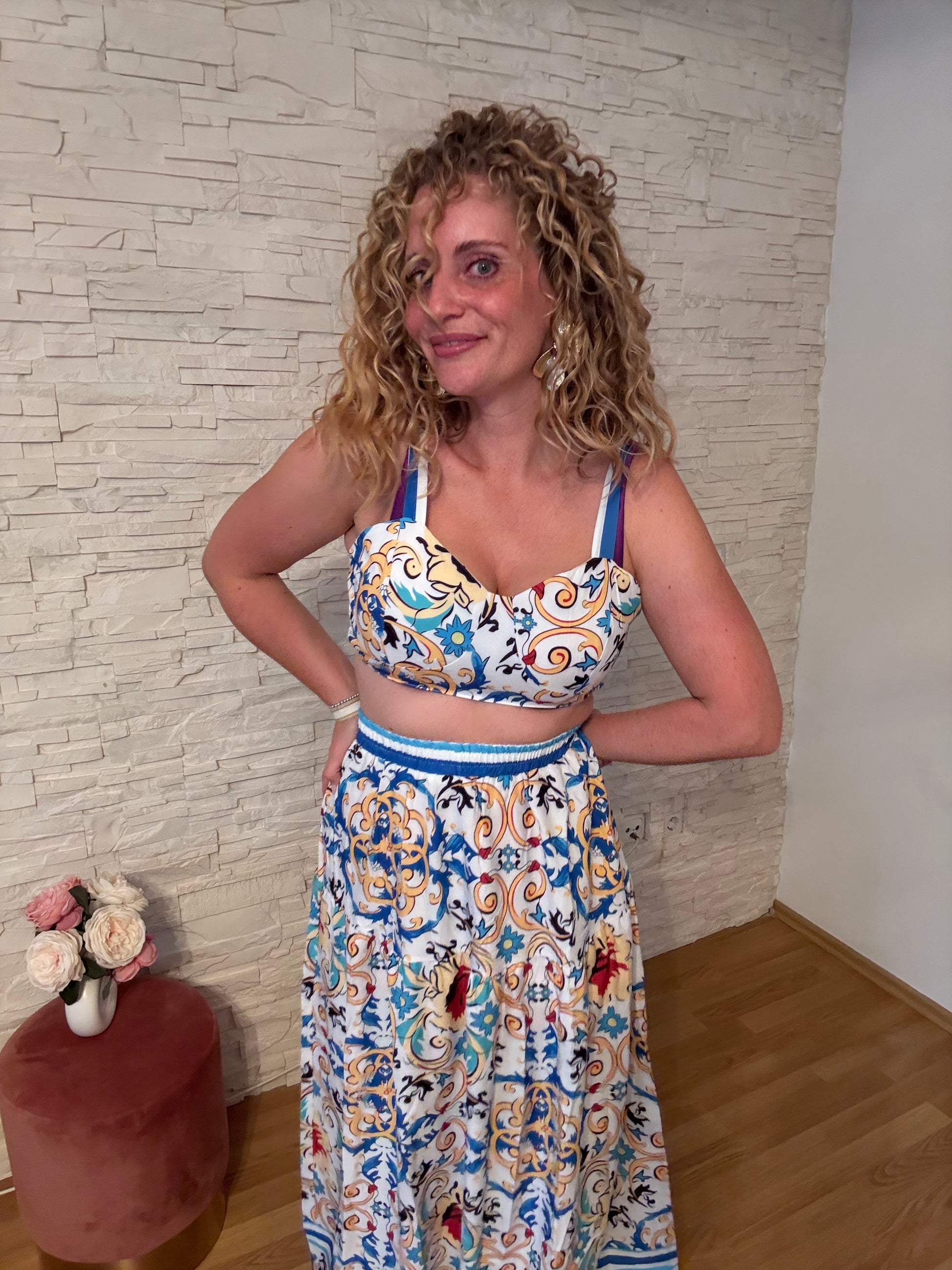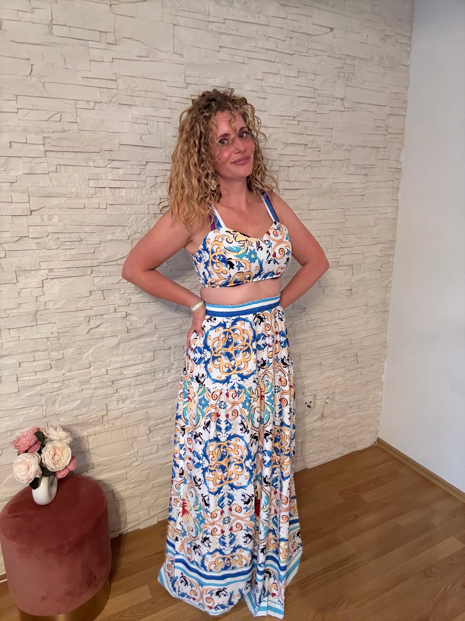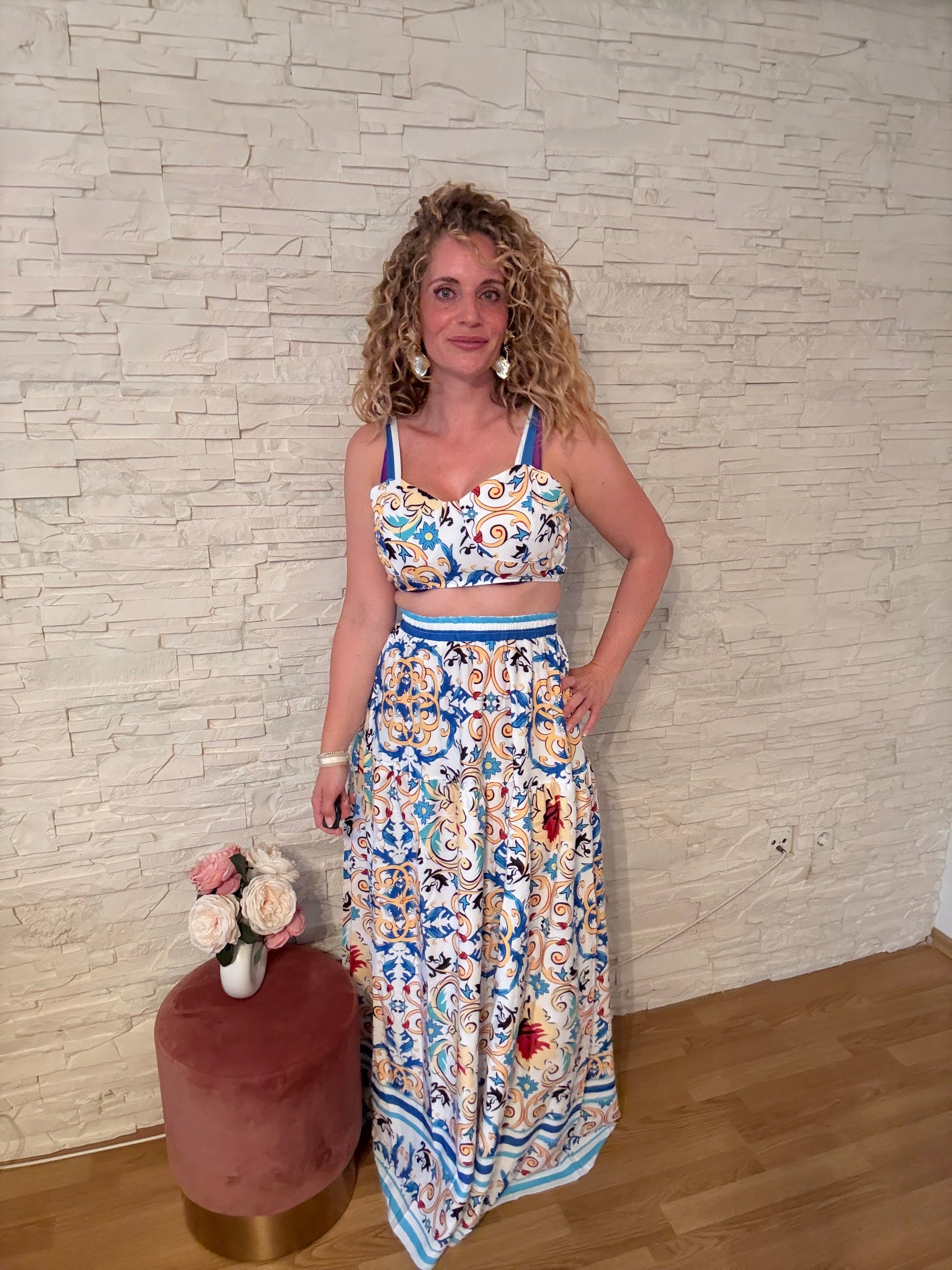 Dolce Vita pur: Dieses Set im farbenfrohen Majolika-Muster bringt italienische Leichtigkeit in deinen Kleiderschrank. Der feminine Schnitt und das mediterrane Design machen es zum idealen Outfit für warme Tage – ob Urlaub oder Sommerfest.